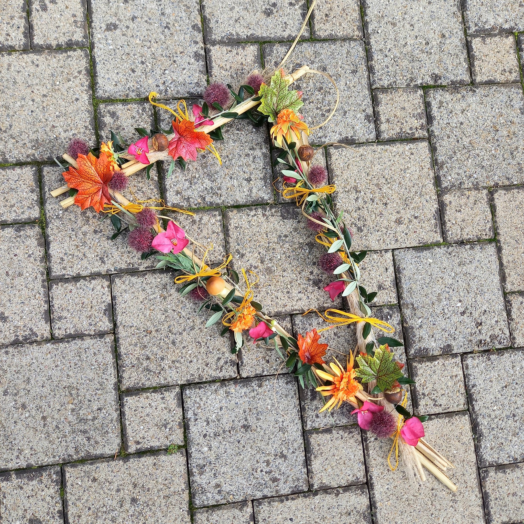 Heute basteln wir gemeinsam einen tollen Herbstlichen Tür oder Wandschmuck aus Naturmaterialien. Ein Farbiges Feuerwerk entsteht! Wir arbeiten mit der Heissleimpistole, Erfahrung damit ist nicht Voraussetzung, aber sicher von Vorteil 😉